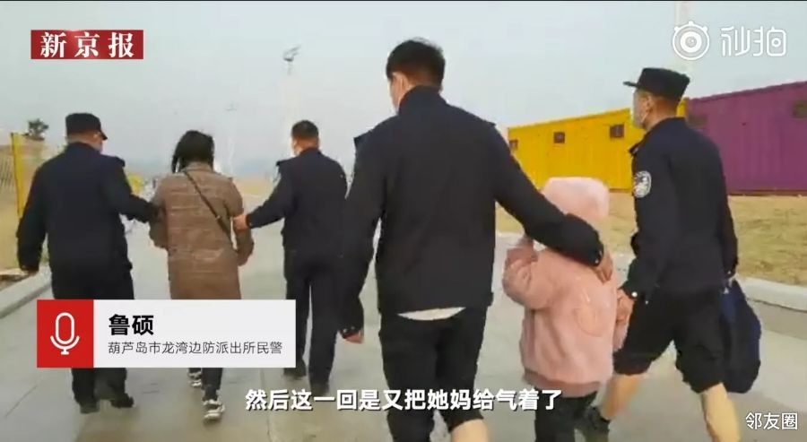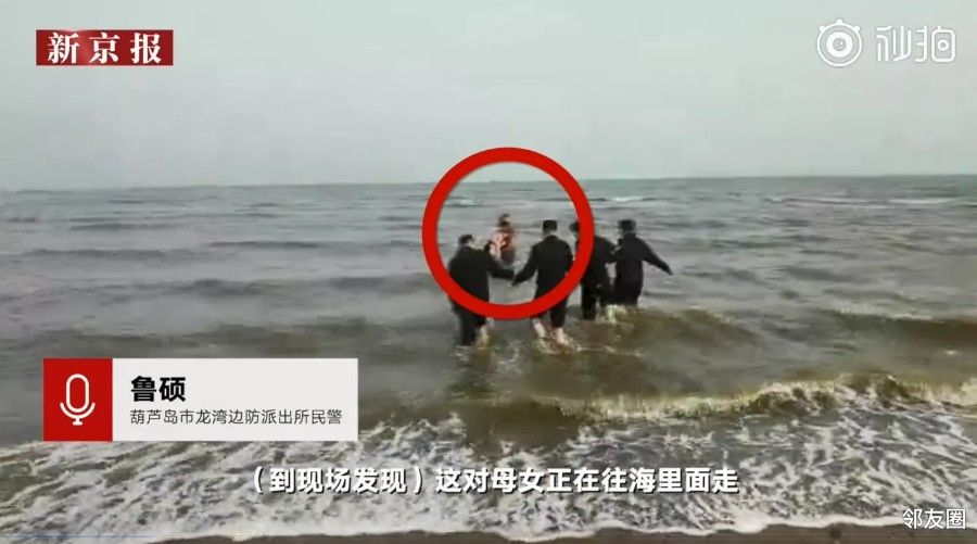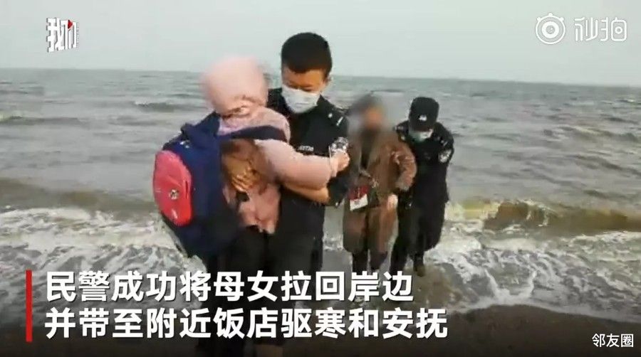 4月15日辽宁葫芦岛市民报警称一对母女欲跳海轻生民警赶到现场发现一年轻女子正拉着一名10岁左右女孩往海里走