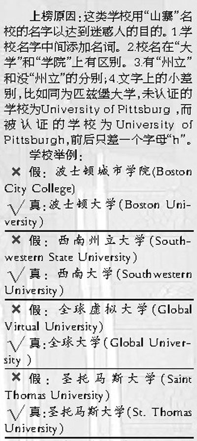 ●登录美国教育部网站数据库查询:美国教育部的官员在接受本报记者采访时表示,为了防止学生受骗,美国教育部建立了一个数据库,目前获认证大学的信息均能搜索到。