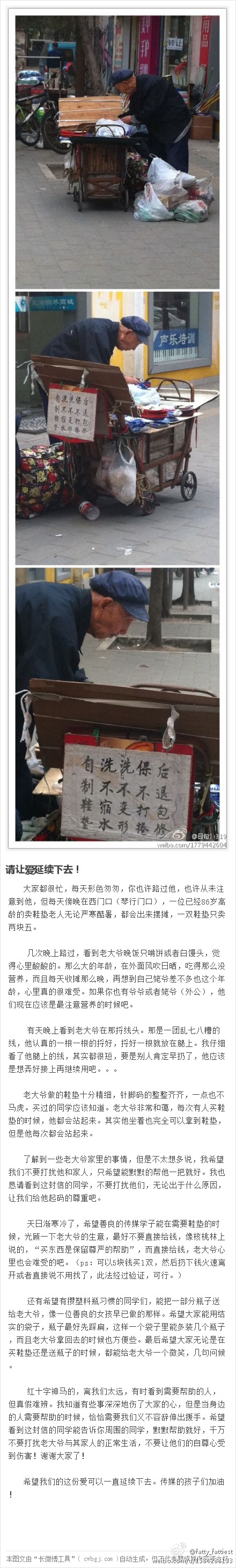 “天日渐寒冷了,希望善良的传媒学子能在需要鞋垫的时候,光顾一下老大爷的生意。”“请让爱延续下去”中写道。(栗世民 少卿)