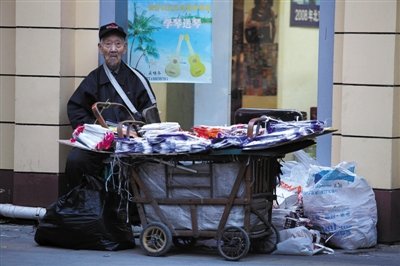 王老人从2007年开始,白天在家做鞋垫,一天下来只能做四五双鞋垫。晚上5点,他带着自己做的和从市场批发来的鞋垫,准时推着小车出来,到传媒大学西门马路的对面卖鞋垫,直到晚上9点半以后才收摊回家。老人的晚餐,就在这四个半小时的某一刻进行,一个凉的、白的馒头,连一杯水都没有。老人称:“喝了水就要上厕所,卖东西还要上厕所不方便。”