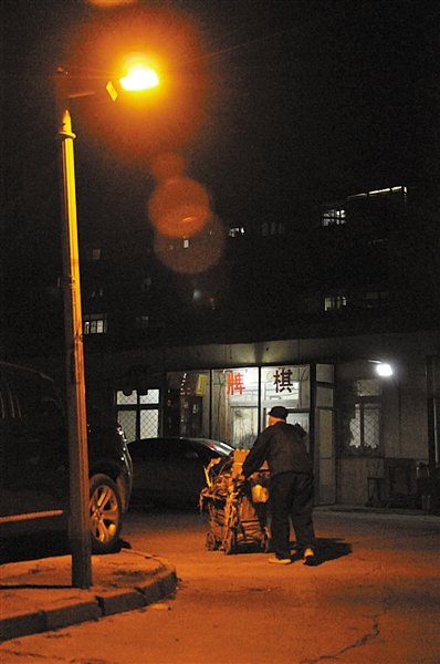 每晚9点半,老人“下班”了。王老人驼着背,将整理好的鞋垫装上车。然后,推着车在昏黄的路灯下,朝家里走去。