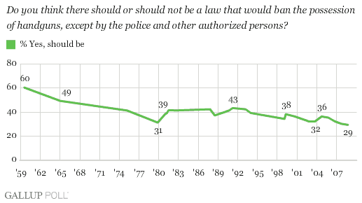 我不知道你哪里找来的数据。我从几个源头找来的数据都是,支持持枪自由的比例占70以上。在保守主义州比例更高