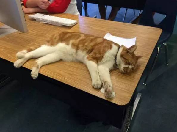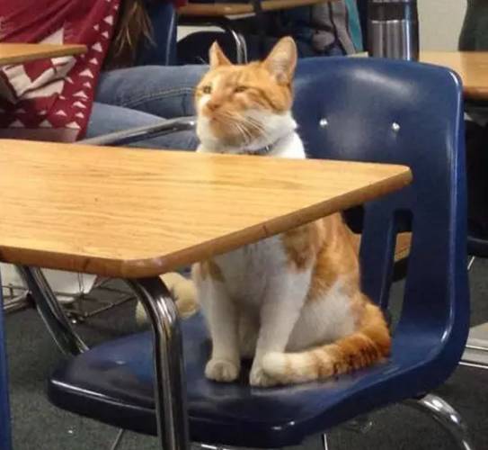 这只猫名叫布巴,原本是一只流浪猫,在三年前被一位书店老板收养,老板起初只是把它关在家里,但它一直“喵喵”地叫个不停,主人就知道它其实想出门去玩,所以就让它自由活动了。结果它摸索着进入了耶鲁大学,从此发现世界上居然还有上课这么“有意义”的事情,于是就每天过来听课了。它非常的“勤奋好学”,无论是刮风还是下雨,它每天都会准时来到教室里听课。原本教室里并没有它的专用座位,它只是蹲坐在教室的角落里,奇怪的是每次老师讲到精彩处,它都会探头探脑,显得很专注,后来同学们就从学校仓库里为它搬来一张桌子和椅子。