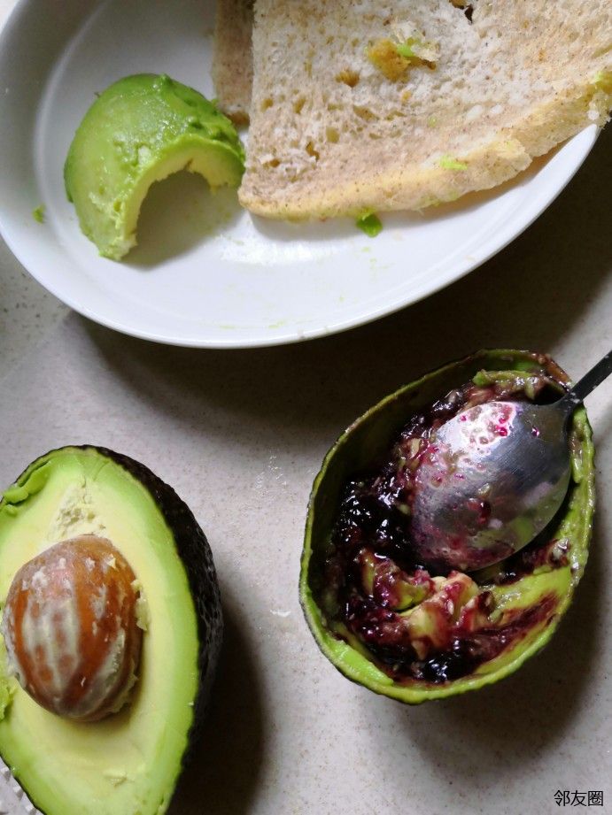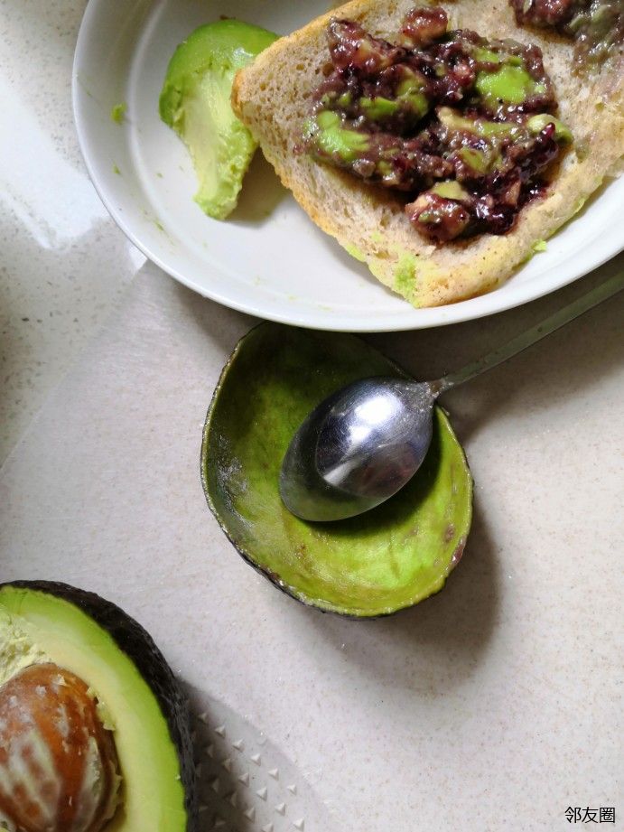 牛油果没那么便宜,我买的都得9元左右一个。我自己得加个鸡蛋或片火腿,再喝杯奶。(空)