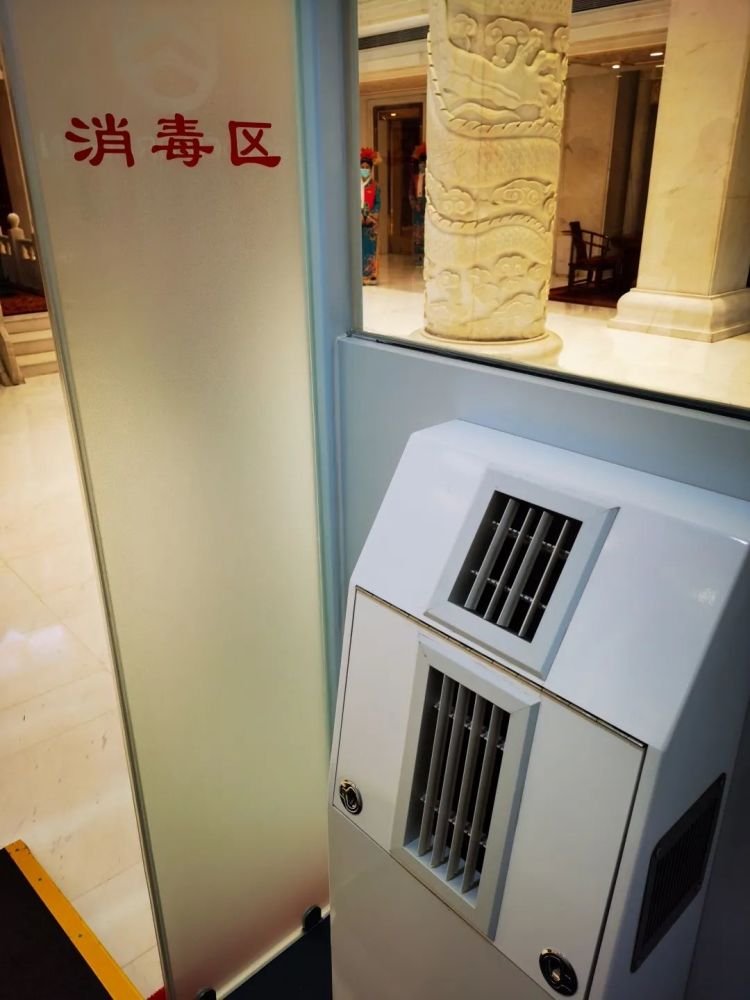 “厨艺”五 从严防控“智能防疫车”、“双筷双勺”助阵 小编特别注意到,餐厅的大门一进来,就有一台特殊的“车”——这是御仙都定制的“智能防疫车”。集测温、消毒、扫码(可扫健康码)为一体,用餐人员进入餐厅前,可通过这部智能防疫车进行全方位消毒。据悉,这也是行业内的第一台。