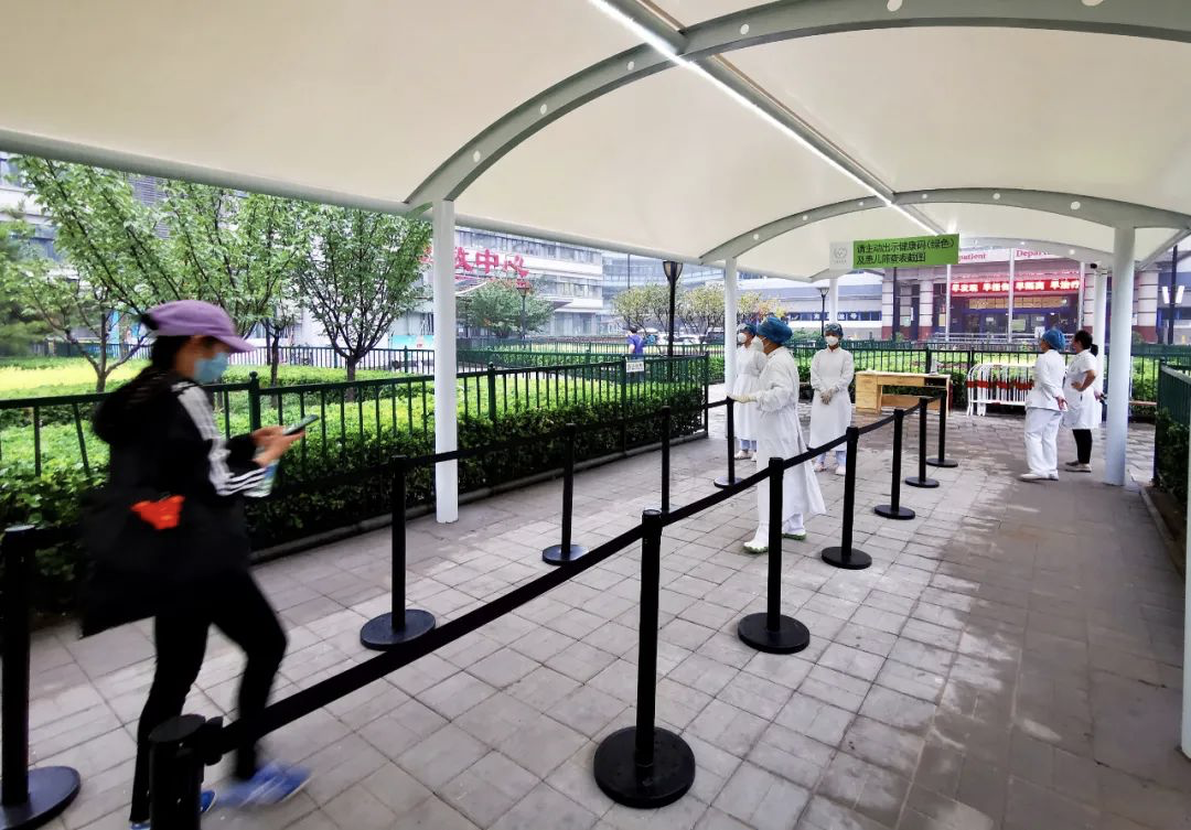 7月12日起,北京儿童医院增设统一安检入口。患儿就医统一从医院东门进入,提前扫码完成北京健康宝查询和新冠筛查表填写,经安检处“安检+测温”合格后,根据预检分诊工作人员导引分别进入对应诊区就诊。急危患者可经急救通道优先就诊。