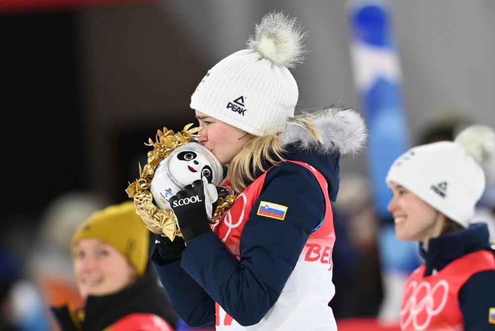 ️2月5日,季军斯洛文尼亚选手妮卡·克里兹纳尔(前)在北京冬奥会跳台滑雪女子个人标准台颁发纪念品仪式上。 为中国队拿下首金的短道速滑队成员 已经成为了全中国前五个拥有金色冰墩墩的人!️