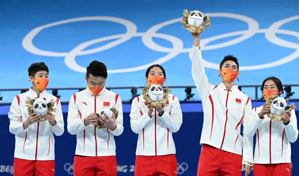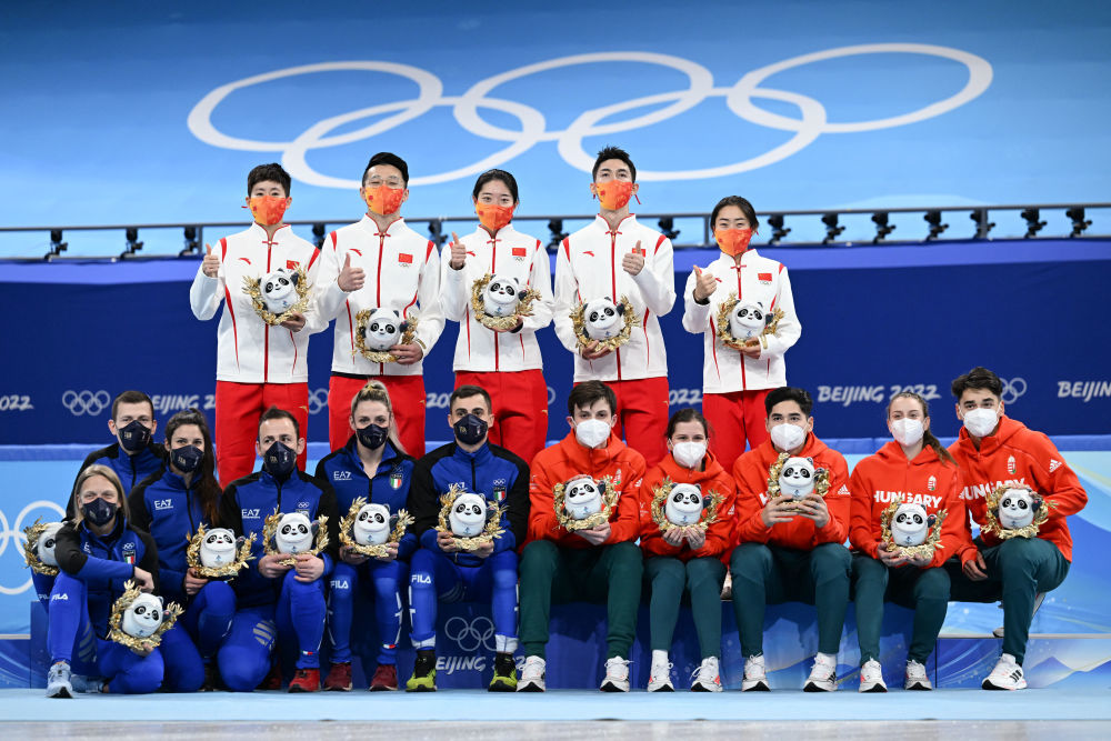 ️2月5日,冠军中国队选手(上)与亚军意大利队选手(下左)、季军匈牙利队选手在北京冬奥会短道速滑项目混合团体接力颁纪念品仪式上。 真是馋哭一群网友️