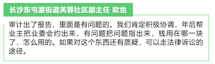 业委会主任刘科说 目前审计正在进行当中 等审计结束 他会澄清所有的问题 眼下 小区所属的长沙市芙蓉社区 也已经介入监督 相信最终会给业主们 一个合理的交代