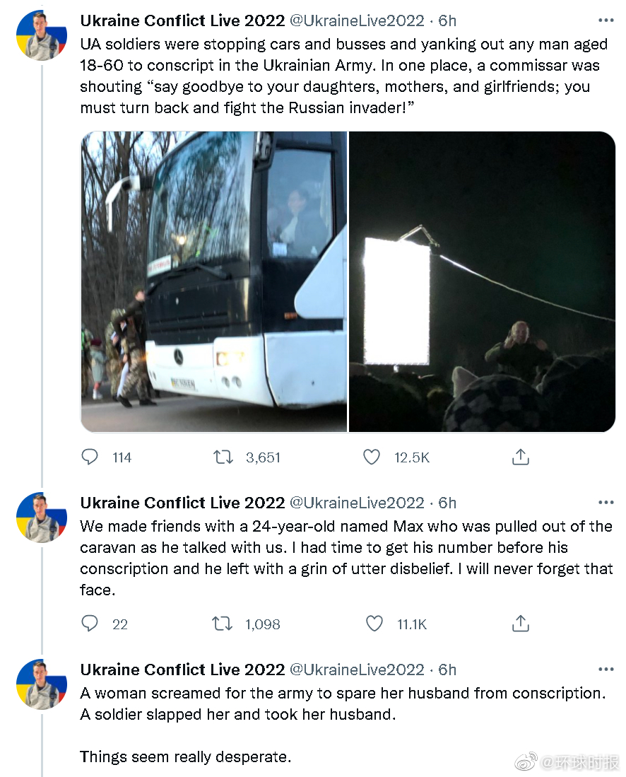 来自美国的独立记者Manny Marotta在他的社交账号上爆料称,他在记录乌克兰民众西逃的路上发现乌克兰的军方正在拦下逃亡的大巴车和轿车,并要求车内18-60岁的男性都必须参加对抗俄罗斯的战斗。他看到一个军官对一车内的人们喊道:“和你们的女儿、母亲以及女友告别吧,你们必须回头对付俄罗斯的入侵者”。 Manny Marotta还称,一名与他在路上成为朋友的24岁年轻人也被这样强征走了。他称自己永远不会忘记当时那名年轻人难以置信的惊恐神情。 他还说自己看到一名女子惊呼着求军队放过她的丈夫。一名士兵给了她一耳光,然后带走了她的丈夫。“那场景太绝望了”。 不过,他的这些说法目前无法被独立验证。