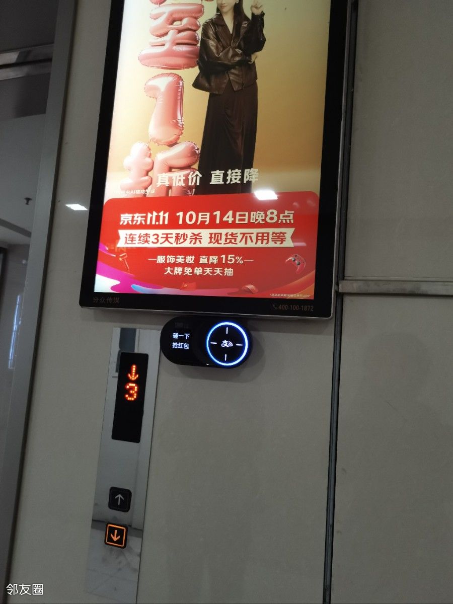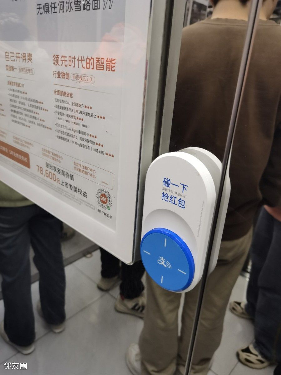 今天在万达的写字楼里,看到支付宝碰一碰,安装在电梯外呼钮旁边,电梯里面也有,感觉到处都是。碰一碰抢红包,这是谁要抢的谁包?