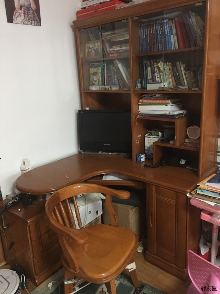 桌子尺寸:126*126*2000。桌面高75。实木材质,桌面以上可以放电脑摆放书籍等,桌下有两个柜子可以放置物品,实木转椅一把。