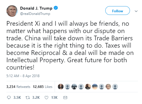 4月1日,中国宣布对美产品加征关税之后,道指周一又大跌了2%,又是一个8000亿美元没了。这下特朗普坐不住了,自己发推特:我们没有与中国进行贸易战!白宫官员也出面紧急喊话:股市乖孩子,别怕,中美两国的关税提议只是第一步,关税可能永远不会出现。